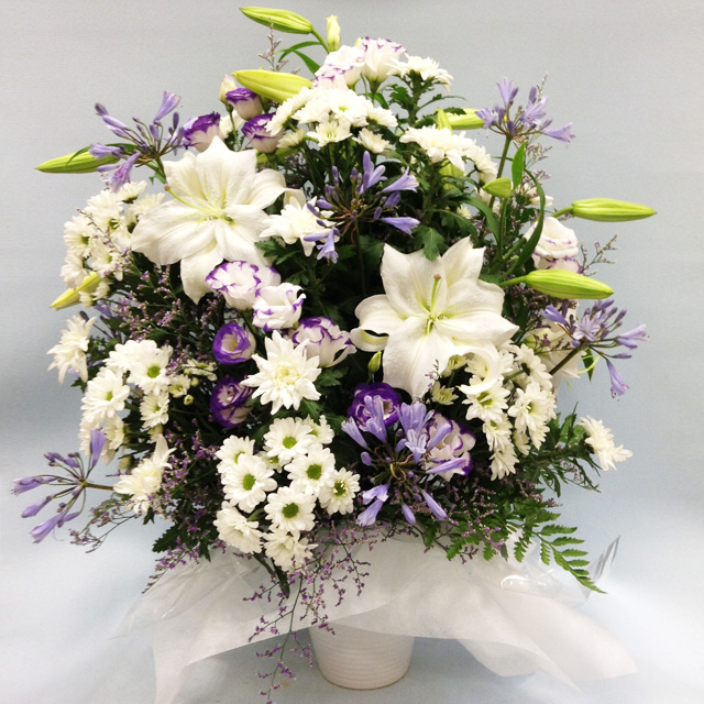 法事・法要・お盆・お彼岸等におすすめのお供えアレンジメントです。淡い紫系のお花でお作りします。